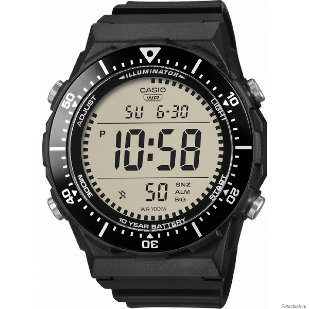 Материал корпуса/безеля: пластикПластиковый ремешокПластиковое стеклоВодонепроницаемость до глубины 100 метровПодсветка: Светодиодная подсветка (янтарный цвет, функция послесвечения, 1,5 или 3 секунды)Мировое время: Отображение времени второго города, поддержка летнего временисекундомер 1/100 секундыДиапазон измерения: 23:59'59,99''Обратный отсчетЕдиница измерения: 1 секундаИнтервал обратного отсчета: 24 часаДругое: автоповторБудильники: 3 многофункциональных будильника (включая будильник с функцией повтора),Почасовой сигнал времениПолностью автоматический календарь (до 2099 года)Формат времени 12/24Специальные функции Режим рыбалки: Отображение пригодности для рыбалки в зависимости от даты и времени (4 уровня).Точность: ±30 секунд в месяцПриблизительный срок службы батареи: 10 лет для батареи CR2032.Размер корпуса: 54,9 × 47,3 × 14,3 ммОбщий вес: 60 г