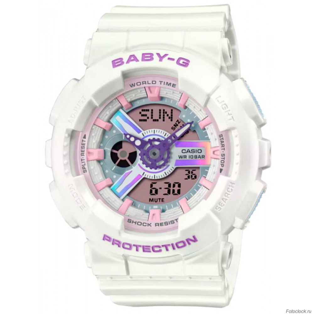 Часы наручные серии Casio Baby-G Baby-G - ударопрочная конструкция защищает от ударов и вибрации.Кварцевые наручные часы. Корпус: Пластик. Ремешок: Пластик. Стекло: Минеральное стекло, устойчивое к царапанию. Водозащита: 100м.Подсветка: светодиодная подсветка.Будильник: 5 независимых будильников + функция будильник с повтором через несколько минут + возможность ежечасного сигнала. Секундомер с точностью до 1/100 секунды. Таймер обратного отсчёта. Режим Мирового времени: Обеспечивает отображение текущего времени в некоторых городах и определенных регионах мира.