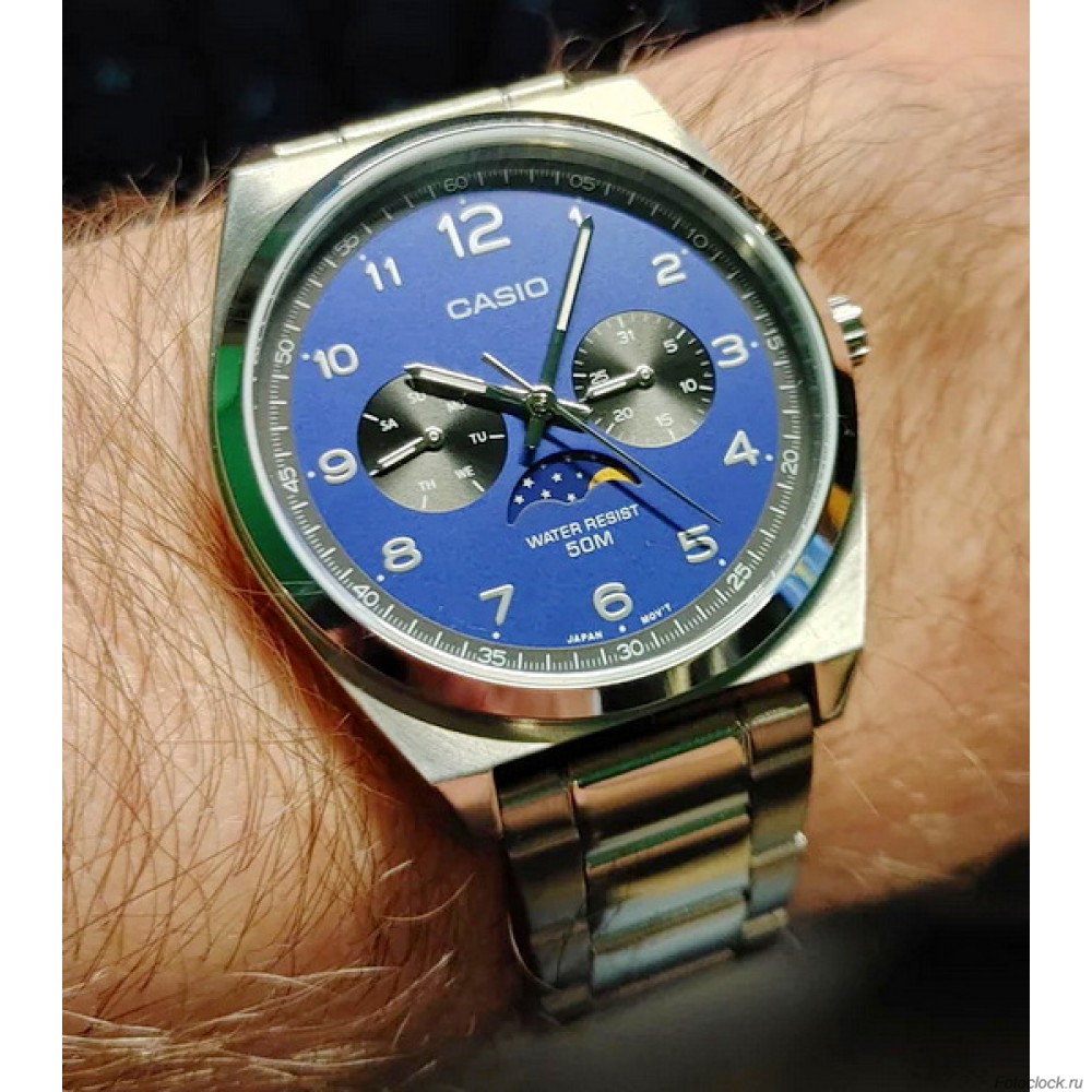 Корпус/безель: нержавеющая стальБраслет: нержавеющая стальМинеральное стеклоВодонепроницаемость 50 метровРегулярные часы хронометражастрелки: 3 стрелки (час, минута, секунда),3 циферблата (дата, день недели, фаза луны)Точность: ±20 секунд в месяцПриблизительный срок службы батареи: 3 года на SR621W.Размер корпуса: 46,6×40×9,3 ммОбщий вес: 109 г